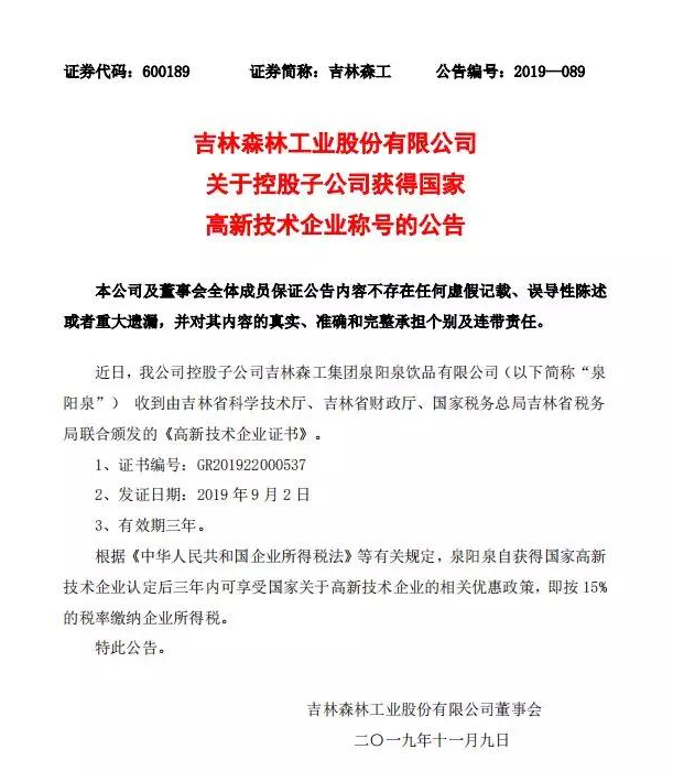 ? ? ? 根據(jù)科學(xué)技術(shù)廳、吉林省財政廳、國家稅務(wù)總局聯(lián)合頒布的《關(guān)于公布吉林省2019年第一批國家高新技術(shù)企業(yè)認(rèn)定結(jié)果的通知》,經(jīng)過層層審核,吉林森工集團(tuán)泉陽泉飲品有限公司由吉林省科學(xué)技術(shù)廳、吉林省財政廳、北京市國家稅務(wù)局、國家稅務(wù)總局吉林省稅務(wù)局局聯(lián)合批準(zhǔn)下發(fā)的高新技術(shù)企業(yè)認(rèn)定。