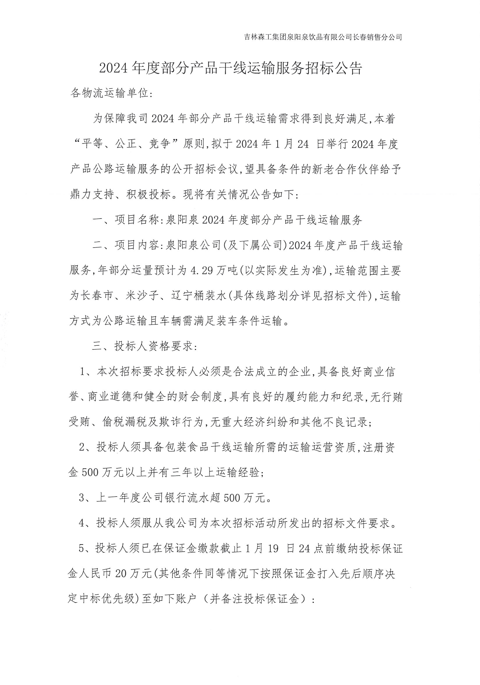 2024年度部分產(chǎn)品干線運輸服務(wù)招標公告